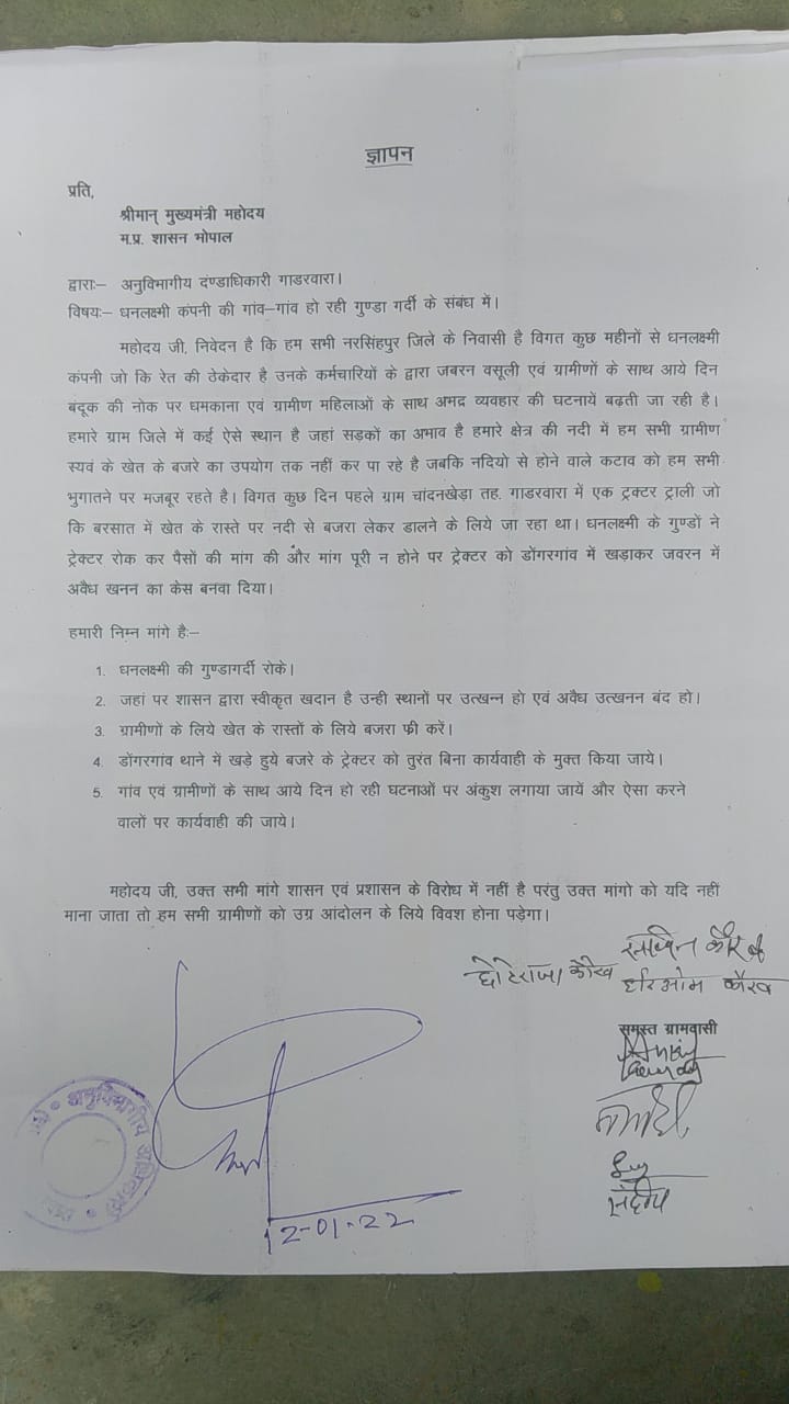ग्रामीणों ने मुख्यमंत्री के नाम अनुविभागीय अधिकारी राजस्व, गाडरवारा को ज्ञापन दिया है जिसमें उन्होंने रेत ठेकेदार कंपनी पर गुंडागर्दी और कई आरोप लगाये हैं
