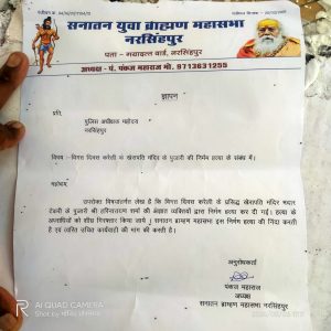 : करेली नरसिंहपुर सनातन युवा ब्राह्मण समाज ने मंदिर में कार्यरत पुजारी की निर्मम हत्या को लेकर एसपी को ज्ञापन सौंपकर घटना के आरोपियों को शीघ्र पकड़ने की मांग की