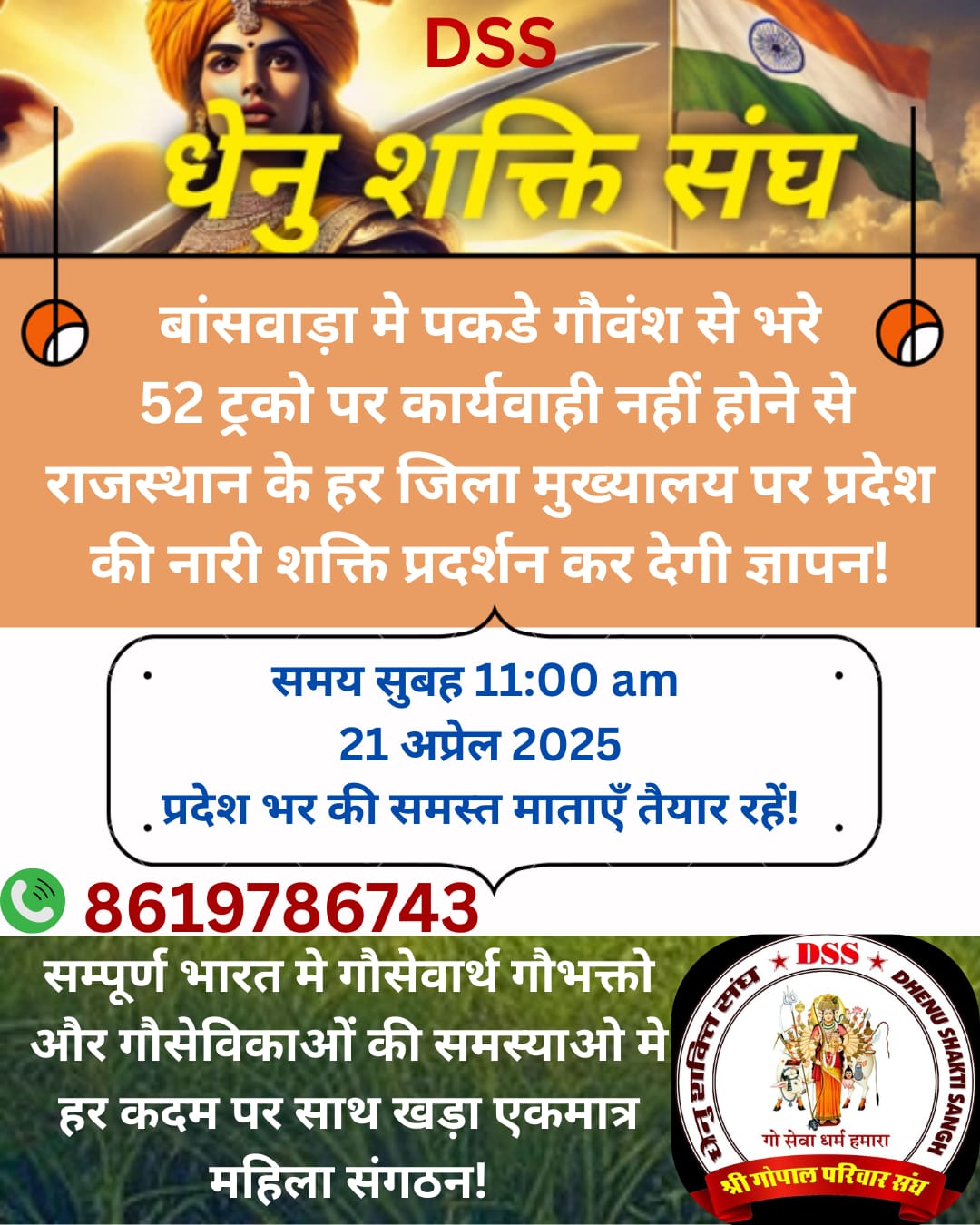 : धेनु शक्ति संघ गो तस्करों पर कार्यवाही के लिए 21अप्रैल को मुख्यमंत्री के नाम सभी जिला कलेक्टर को ज्ञापन देगा- साध्वी निष्टा गोपाल सरस्वती