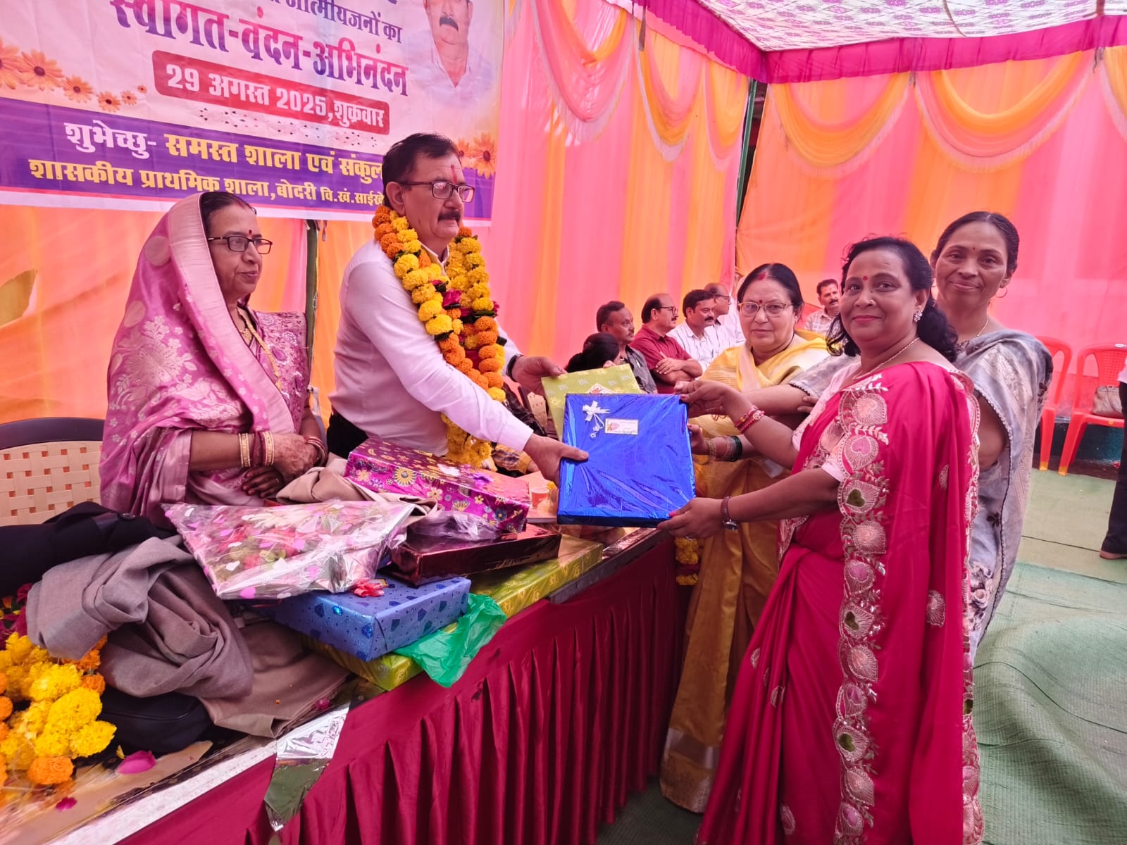 गाडरवारा। गत दिवस समीपी ग्राम बोदरी की शासकीय प्राथमिक शाला में सहायक शिक्षक महेश अधरुज का शासकीय सेवा से सेवानिवृत्त होने पर विदाभिनंदन कार्यक्रम आयोजित किया गया। कार्यक्रम का शुभारंभ मंचासीन अतिथियों द्वारा विद्या की देवी माँ सरस्वती के चित्र का पूजन कर किया गया। तदोपरांत श्री अधरुज सहित अतिथियों का स्वागत माला पहनाकर एवं पुष्प गुच्छ देकर किया गया। इस अवसर पर श्री अधरुज को शाल, श्रीफल, विदाभिनंदन पत्र एवं उपहार देकर विदाई दी गई। कार्यक्रम को सम्बोधित करते हुए साहित्यकार कुशलेन्द्र श्रीवास्तव ने कहा कि श्री अधरुज ने अपने सेवाकाल में अच्छे कार्य किये। सहायक संचालक सुश्री सीमा डोंगरे ने कहा कि शासकीय सेवा में सेवा निवृत्ति एक प्रक्रिया का हिस्सा है। इस कार्यक्रम को अनेक वक्ताओ ने भी सम्बोधित किया। कार्यक्रम का संचालन नगेन्द्र त्रिपाठी एवं आभार प्रदर्शन शिक्षक अमित जैन ने किया। इस आयोजन में भाजपा नेता अशोक भार्गव, सेवानिवृत प्राचार्य राजेश बरसैयां, आरती पाठक,अनूप शर्मा, प्राचार्य प्रतुल इंदुरख्या, सुनीता पटैल, एस के मिश्रा, जयमोहन शर्मा, सुशील शर्मा, लेखा कौरव, बीआरसी संदीप स्थापक, महेश तिवारी, विनोद कौरव, अनिल स्थापक अमिकांत जैन,बीएसी पवन राजोरिया, सीएसी देवी सिंह कीर, प्रदीप मालवीय, सिराज अहमद सिद्धिकी, मधुसूदन पटैल, पंकज स्थापक, मंजूलता मेहरा, विद्या शर्मा, प्रतिभा तिवारी, प्रीति विश्वकर्मा सहित ग्राम सरपंच भाईजी कहार, शिवकुमार कहार, सचिव बलराम कौरव, रामपाल राजपूत एवं छात्र छात्राएँ उपस्थित रहे। विदित हो कि श्री अधरुज को शासकीय प्राथमिक शाला बरेली से भी स्कूल स्टॉफ ने विदाई दी।