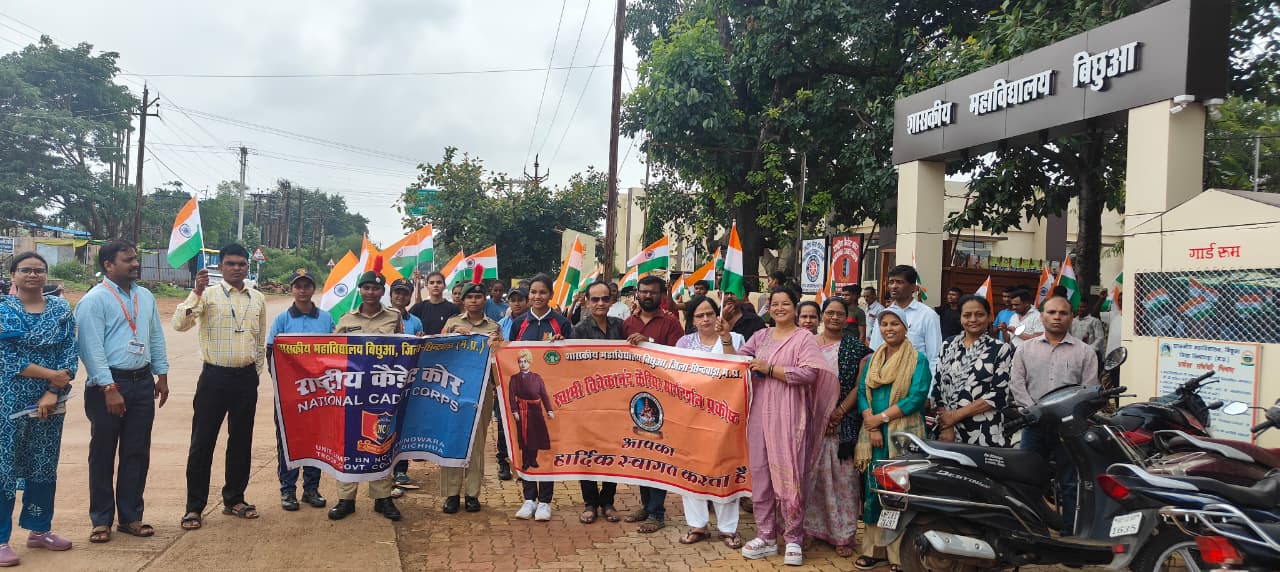 )तिरंगा यात्रा की थीम पर शासकीय महाविद्यालय बिछुआ में एनसीसी कैडेट्स के द्वारा बिछुआ नगर में तिरंगा रैली निकाली गई लेफ्टिनेंट रघुवीर उइके ने जानकारी देते हुए बताया कि शासकीय महाविद्यालय बिछुआ में एनसीसी कैडेट्स के द्वारा एमपी एनसीसी बटालियन छिंदवाड़ा के कमांडिंग ऑफिसर थॉमस ओमन के निर्देशन व महाविद्यालय के प्रभारी प्राचार्य डॉ. पूजा तिवारी एवं आइक्यूएसी प्रभारी डॉ.अजीत डेहरिया के मार्गदर्शन में प्राचार्य ने महाविद्यालय की तिरंगा रैली को हरी झंडी देकर अग्रसर किया तिरंगा रैली में बिछुआ पुलिस, शासकीय उत्कृष्ट विद्यालय बिछुआ के विद्यार्थी शिक्षक, शासकीय कन्या शाला के विद्यार्थी, शिक्षक ने उत्साह पूर्वक भाग लेकर रैली को सफल बनाया जिसमे प्रमुख रूप से बिछुआ पुलिस ने यातायात व्यवस्था को बनाए रखने में महत्वपूर्ण भूमिका निभाई एनसीसी कैडेट्स में शिवानी डेहरिया,मयूरी अवथरे,आनंद कुमरे,सपना धुर्वे, दीपक पंद्राम,पूजा चौरिया,ब्रिजेश उईके,सुमित साहू,वर्षा कुमरे , रागिनी बेलवंशी,गोरी टांडेकर,रीना सोनेवार एवं महाविद्यालय में नवीन भर्ती वाले कैडेट्स ने भाग लिया महाविद्यालय के सहायक प्राध्यापक डॉ साक्षी सहारे डॉ शाहिदा मंसूरी डॉ फरहत मंसूरी डॉ. अनिल कुमार अहिरवार रामप्रकाश डेहरिया, दुजारी बोसम,ग्रंथपाल श्री मनीष पटेल उपस्थित रहे एवं समस्त अधिकारी/ कर्मचारी व छात्र छात्राओं का विशेष योगदान रहा।