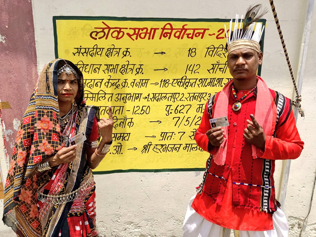 : विदिशा में गोंड जनजाति के पति-पत्नी ने पारम्परिक परिधान पहनकर मतदान किया