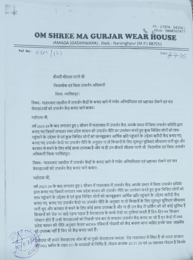 : गाडरवारा में गर्मी की फसल मूंग उड़द खरीदने हेतु बनाए गए उपार्जन केंद्र बनाने में हुई गंभीर अनियमितता एवं भ्रष्टाचार,वेयरहाउस संचालक ने की कलेक्टर से शिकायत