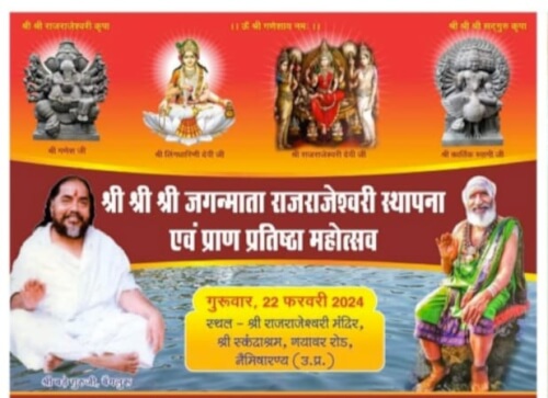 श्री श्री श्री जगन्माता राजराजेश्वरी स्थापना एवं भव्य प्राण प्रतिष्ठा महोत्सव..22 फरवरी को सीएम योगी आदित्यनाथ, मोहन यादव, शिवराज व तोमर करेंगे नूतन देवालय के चितशक्ति मुख्यद्वार का उद्घाटन..महाअनुष्ठान में अनेक संत महात्माओं का पदार्पण, प्रतिदिन कथा प्रवचन व रासलीला..करेली। विदेह कैवल्य मुक्त, परमहंस, परिव्राजकाचार्य, ज्ञानाक्षी पीठाधीश्वर, अनंत श्री विभूषित, स्वामी शिवरतन पुरी जी महाराज (श्री तिरुचि स्वामी जी महाराज) श्री कैलाश आश्रम, श्री राजराजेश्वरी नगर बेंगलुरु की महती कृपा से उत्तर प्रदेश के श्री नैमिषारण्य पुण्य तीर्थ स्थित श्री राजराजेश्वरी मंदिर, स्कंदाश्रम, गयावर रोड में आयोजित श्री श्री श्री जगन्माता राजराजेश्वरी स्थापना एवं प्राण प्रतिष्ठा महोत्सव के पावन अवसर पर भारतवर्ष के अनेक संत महात्माओं का पदार्पण होगा एवं प्रतिदिन कथा प्रवचन व रात्रि रासलीला का भव्य आयोजन है। श्री मां राजराजेश्वरी जी, श्री मां नर्मदा जी के अनन्य साधक, तपोनिष्ठ संत प्रवर, परिव्रजकाचार्य, अनंत श्री विभूषित, परम पूज्य सदगुरुदेव श्री श्री श्री स्वामी जी महाराज हीरापुर वालों एवं श्री राजराजेश्वरी भक्त मंडल हीरापुर धाम मप्र के संयोजकत्व में आगामी 14 फरवरी से 22 फरवरी 2024 तक आयोजित महोत्सव में नव्य, भव्य एवं दिव्य मंदिर में ललिता, पराम्बा, भगवती, महादेवी, श्रीविद्या, महात्रिपुरसुंदरी मां श्री श्री श्री राजराजेश्वरी देवी जी की भव्यातिभव्य स्थापना की जावेगी।*चितशक्ति द्वार (प्रमुख द्वार) का उद्घाटन..*नैमिषारण्य धाम गयावर मार्ग पर नवनिर्मित श्री स्कंदाश्रम, श्री श्री श्री जगदंबा राजराजेश्वरी के नूतन देवालय के चितशक्ति द्वार (प्रमुख द्वार) का उद्घाटन गुरुवार 22 फरवरी 2024 को मध्यान्ह 1 बजे श्री गोरखनाथ पीठाधीश्वर, अनंत श्री विभूषित, पूज्य योगी आदित्यनाथ जी महाराज (मुख्यमंत्री उत्तर प्रदेश शासन) के कर कमलों से संपन्न होगा। इस अवसर पर मध्य प्रदेश के मुख्यमंत्री डॉ मोहन यादव, पूर्व मुख्यमंत्री शिवराज सिंह चौहान, विधानसभा अध्यक्ष नरेंद्र सिंह तोमर सहित अनेक विशिष्टजनों की विशेष, सारस्वत उपस्थिति रहेगी।*भारतवर्ष के संत महात्माओं का पदार्पण..*भव्य अनुष्ठान में आमंत्रित धर्माचार्य, संत महात्माओं में अनंत श्री विभूषित जगतगुरु शंकराचार्य स्वामी वासुदेवानंद जी महाराज ज्योर्तिमठ बद्रीकाश्रम उत्तराखंड, श्रीमद् जगतगुरु पूज्य रामानुजाचार्य स्वामी विश्वेशप्रपन्नाचार्य जी महाराज रामकथा प्रवक्ता सुग्रीव किला अयोध्या, अनंत श्री विभूषित पूज्य कामदगिरि पीठाधीश्वर श्रीमद जगतगुरु रामानंदाचार्य श्री रामस्वरूपाचार्य जी महाराज कामदगिरि मुख्यद्वार चित्रकूट, अनंत श्री विभूषित पूज